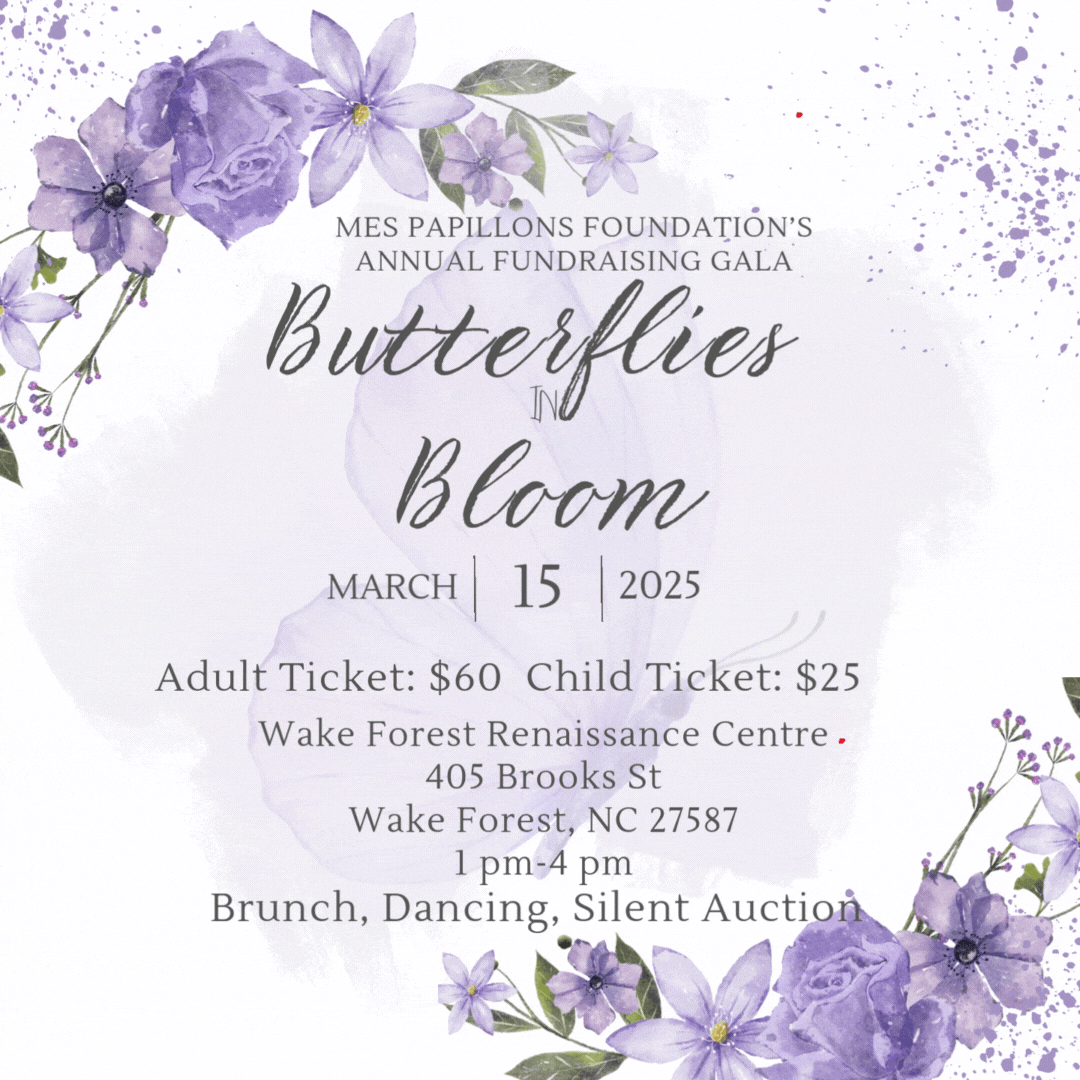 We are excited to invite you to our 3rd Annual Fundraising Gala on March 15, 2025, at the Wake Forest Renaissance Centre. This event will feature brunch, dancing, and a silent auction, all while supporting Mes Papillons Foundation's mission to provide vital medical equipment to children with rare diseases. Get your tickets today and join us in making a difference!